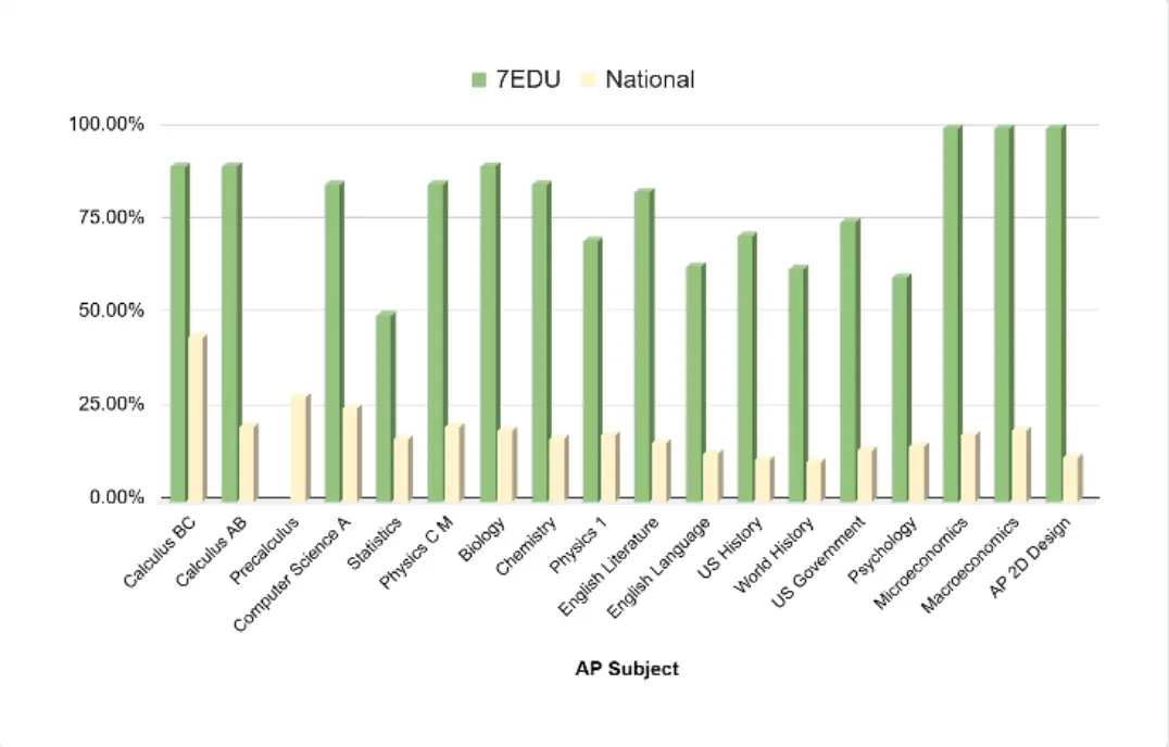 The percentage of 7EDU students who receive a FULL score of 5 on AP exams is five times the national average.